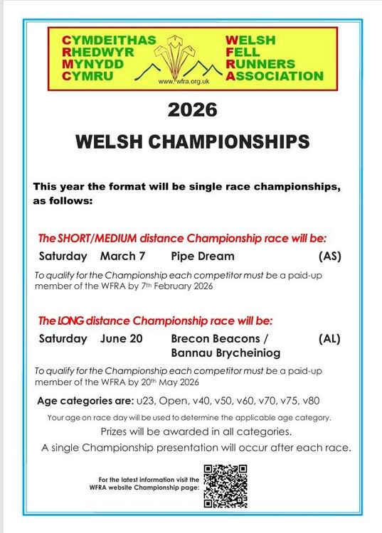 Following a consultation of members about the future of the Welsh Championship we have decided to move from the Series style championship to a single race Championship for Short/Medium distance, and a separate Championship for Long distance races, similar to the new format of the UKA British Championship.